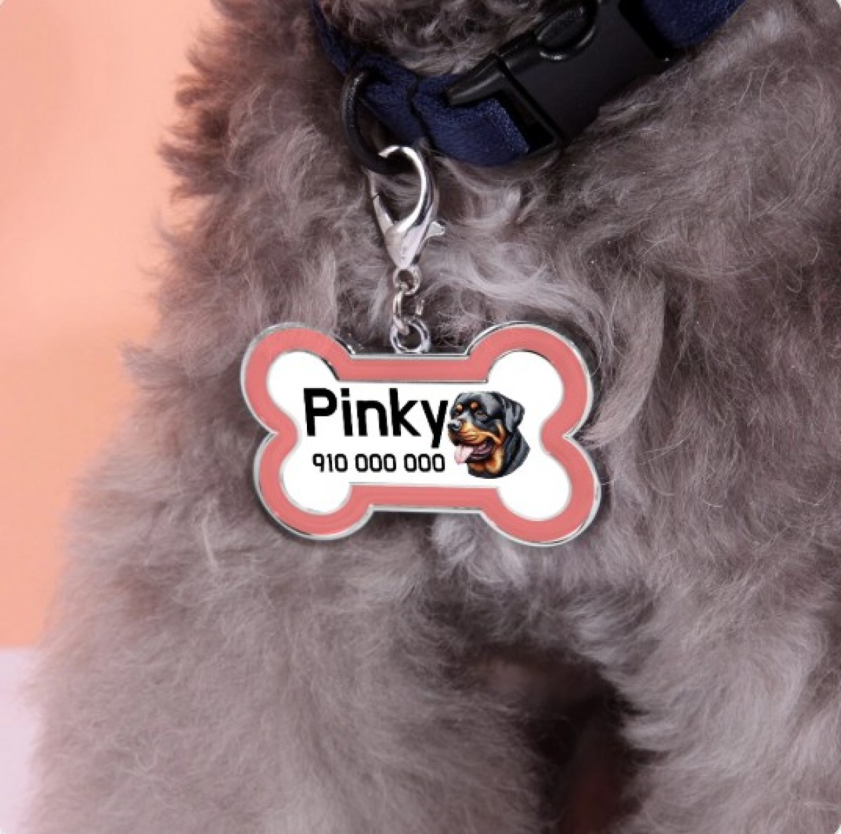 Proteja o seu animal de estimação, caso ele fuja ou se perca. Coloque o nome e até mesmo um telefone de contacto. Personalize e crie prendas exclusivas. Oferta do tratamento da qualidade da sua imagem e enviamos a prova antes da produção. Aproveite os portes grátis.