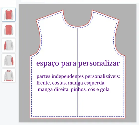 - Pixeis recomendados para a personalização: 3150 x 3572 (frente e costas), 3150 x 3923 (mangas)